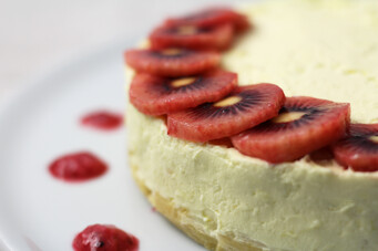 RED KIWIFRUIT COULIS & CUSTARD CHEESECAKE