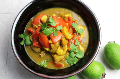 Return the chicken to the pan with the feijoas and curry powder. Season with salt and pepper, if preferred.