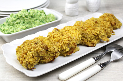 Dip the thighs into the chips to coat evenly. Place in a single layer in the roasting pan. Bake for 40-45 minutes until golden and cooked. Serves 4.