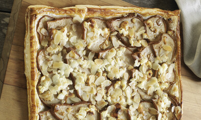 Join the pastry sheets together to make a 20cm x 30cm rectangle. Lay on the prepared tray. With a sharp knife, score a rim around the edge of the pastry taking care not to cut all the way through. Prick the inside with a fork. Arrange the pear slices inside the rim.