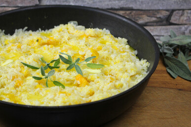Heat the butter in an oven-proof frying pan. Sauté the onion until softened then stir in the garlic and sage. Cook for 1 minute. Add the rice and stir to coat in the butter. Pour in the wine, stirring until evaporated.