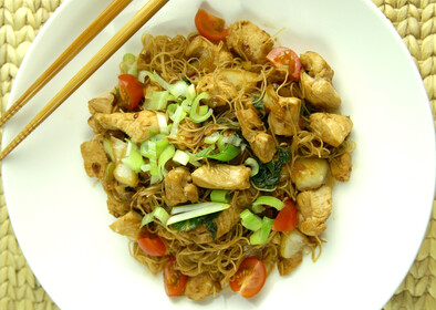 Toss the noodles with the chicken mixture, until well coated. Great sprinkled with chopped spring onion. Serves 2.
