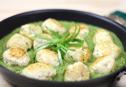 To make the sauce, wash and chop the spinach. Steam or microwave until limp. Cool a little then squeeze dry and chop again.