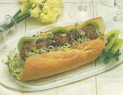 Meanwhile, heat the bread lightly in the oven. Cut each piece in half lengthwise. Fill with the salad ingredients and top with the meatball skewers. Serves 4.