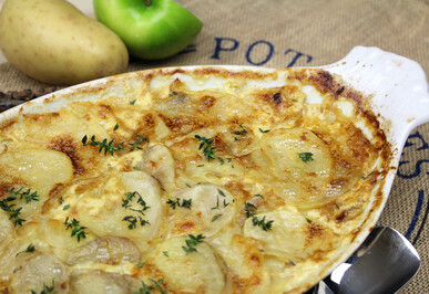 Peel and thinly slice the potatoes. Core and thinly slice the apple. Lightly butter a 1 litre baking dish.