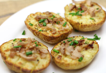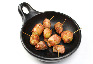 Wrap each potato in a piece of bacon and secure with a toothpick. Place in the roasting pan. Bake for 20-30 minutes until the potatoes are tender.