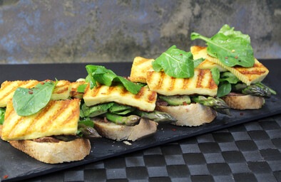 Spread the toasted ciabatta with the antipasto mixture. Top with the well-drained asparagus and the avo. Toss the rocket and mint in the remaining vinaigrette and place on the avo. Top with the halloumi. The toasts can be sprinkled with a few chilli flakes, if preferred. Serves 4 as a light meal.