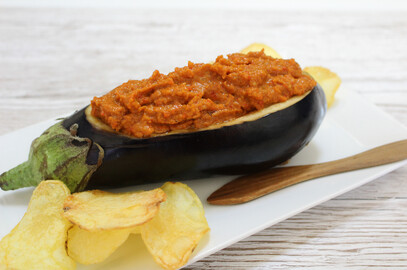 With a sharp knife cut a slice off the side of the eggplant. Using a spoon or sharp knife remove the pulp from the inside leaving a 1cm-thick shell. Place aside.