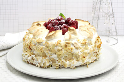 Bake for 4-5 minutes or until lightly browned. Carefully remove to a serving plate. Cool. Refrigerate for up to 4 hours or overnight. Just before serving, place the fresh raspberries on top of the cake in the centre. Serves 10-12.