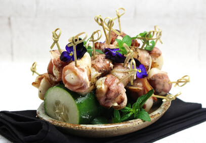 Fill the lychees with about a teaspoon of cream cheese. Wrap securely in a strip of bacon and secure with a long cocktail stick. Pan-fry or grill for about 2-3 minutes each side.