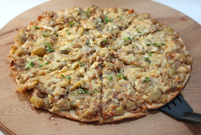 Spread over the pizza base right to the edge. Sprinkle with the cheese. Place on the hot oven tray and bake for 15-20 minutes or until golden. Great garnished with fresh thyme sprigs. Serves 8 as a nibble.