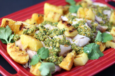 Cut the warm chicken into serving portions and place on a platter. Add the charred pineapple and orange, then spoon the sauce over. Serves 4-6.