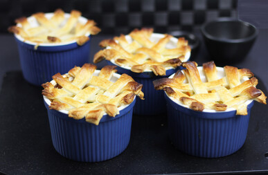 Cut the pastry into 1.5cm strips. Criss-cross them over the top of each ramekin. Bake for about 20 minutes until hot and the pastry is golden. Serves 4.