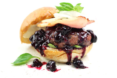 Spread the cut side of the toasted buns with mayo. Top the base buns with half the basil leaves. Top with the venison patties, 2-3 tablespoons of the blueberry sauce, then the bacon, onion and more basil. Cover with the bun tops. Serves 4.