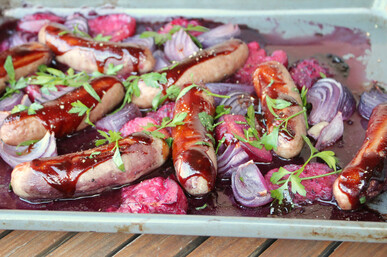 TRAY-BAKED STICKY PLUM SAUSAGES