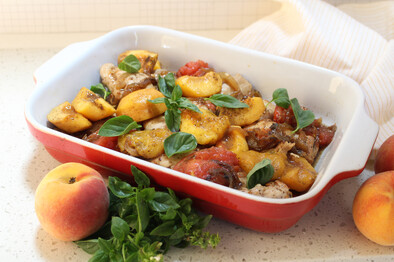 Add the balsamic vinegar and boil for a minute then stir in the honey. Add the peaches and tomatoes. Tuck the chicken between the fruit together with the basil leaves. Cover and simmer gently for about 15 minutes, until cooked. Great served with mash or rice. Serves 4.