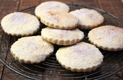 Roll out the dough until 1cm thick. Using a 6-7cm diameter biscuit cutter, make about 24 rounds. Off-cuts may be pressed together, re-rolled then cut. Place on the baking trays. Brush with milk and dust with the cinnamon sugar.