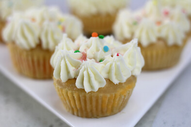 Spread or pipe the vanilla frosting (recipe follows) on each and decorate with coloured sugar and/or sprinkles or finely grated lemon rind. Makes 12.