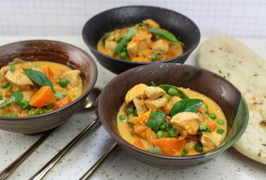 Add the pumpkin and carrots and coconut milk. Cover and simmer on low heat for about 15 minutes until the chicken and vegetables are cooked. Add the peas and heat through. Great served with hot naan bread or boiled rice. Serves 4.