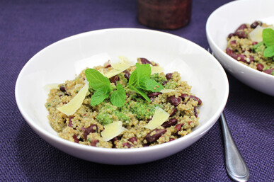 To prepare the risotto, heat the oil in a medium saucepan. Sauté the shallots for 1 minute. Add the quinoa and stir for about 30 seconds. Add the boiling water, Cover loosely and simmer for about 20 minutes until tender. Drain reserving about 1 cup of the cooking water. Add the kidney beans.