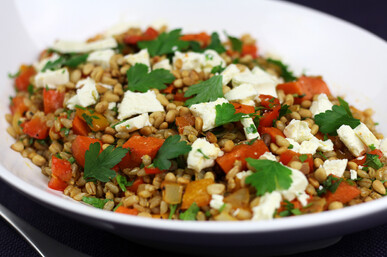Drain the barley, season with salt and pepper, and add the garlic, parsley and lemon juice. Add to the roasted veg. Serve topped with the feta cheese and pine nuts. Serves 6.