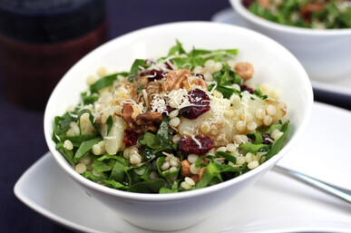 Place the cold couscous in a large bowl and add the pears, spinach, walnuts and craisins. Toss gently to combine. Season. Serve drizzled with the dressing of your choice and sprinkle with cheese. Serves 4.