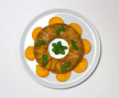 Spread evenly over the base of the cake pan. Place the persimmon on top overlapping each slice slightly.