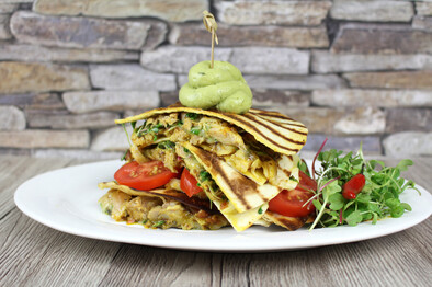 Place the chicken on the base of two of the flour tortillas. Top with the cheese, salsa and sprouts. Top with the remaining tortillas.