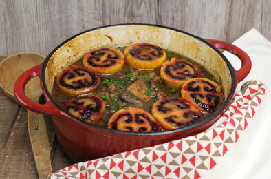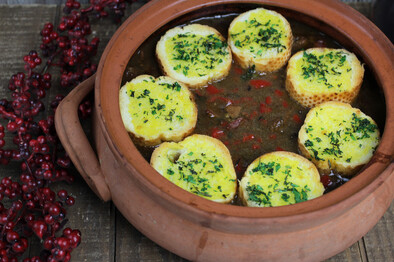 Ten minutes before the end of cooking time, remove the casserole lid and stir in the red capsicum. Spread the croutons with butter and herbs and place on top of the meat. Cook for 10 minutes. Serves 6-8.