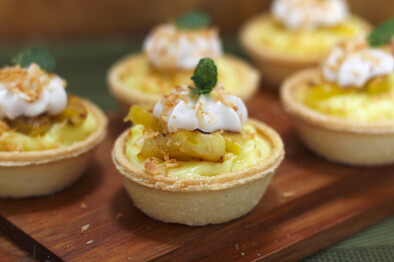 Fill the tartlet shells with the custard. Top with pieces of pineapple and a swirl of piped whipped coconut cream. Sprinkle with the toasted coconut. Makes 12 small tartlets.