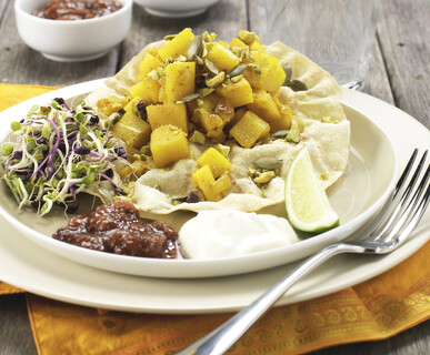 Meanwhile, heat the pappadums in the microwave for about 30 seconds each. Serve the curry topped with the nuts and seeds and accompanied by the other extras. Serves 3-4.