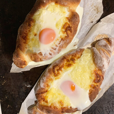 Bake for 15 minutes. Using a spoon, form a well in the centre of each bread. Crack an egg into each well. Bake for another 3-4 minutes. The egg should still be runny. Top with the butter and salt.