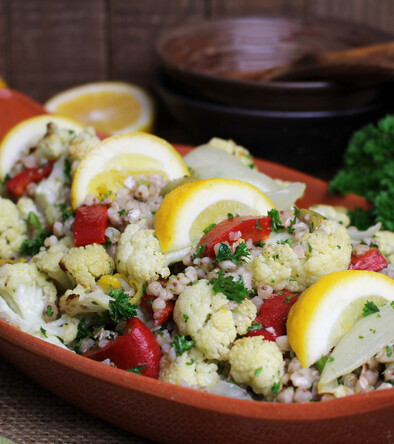 Cut the cauli into medium-large florets. Place in a large roasting pan with the onion and olive oil. Toss to coat and season. Roast for 15 minutes, stir, then add the capsicum. Continue cooking until the cauli is tinged with brown and is tender.