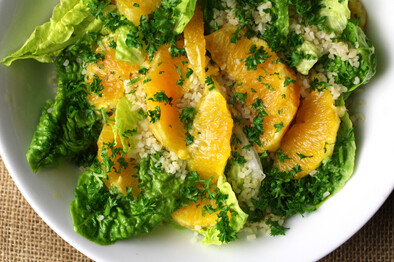 Peel and segment the 2 oranges. Combine with the bulghur, cos and parsley. Drizzle with the dressing and serve. Serves 4.