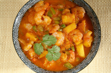 Sauté the onion in the oil in a large pan, until tender. Add the celery, capsicum, pasta sauce, pineapple and chilli flakes. Stir well, then simmer for 3-4 minutes. Add the prawns and heat through.