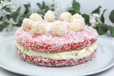 Place one sponge layer on a flat serving plate, jelly side down. Brush the top with a little of the reserved lychee juice. Top with the cream mixture. Cover with the second sponge layer, jelly side up. Garnish with the remaining lychees sprinkled with a little coconut. Cover and refrigerate for at least 1 day for the flavours to develop. Serves 6-8.