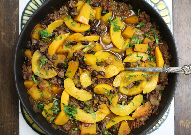 Add the black beans and peaches and cook for a further 15 minutes. Serves 4-6.
