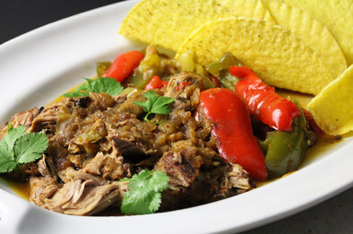 To serve, shred the pork and serve in taco shells or burrito wraps with the onion, capsicum and chilli. Serves 6.