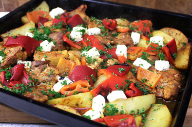 Roast for 30 minutes turning halfway through. Add the capsicum and feta cheese and cook for a further 10 minutes. Serves 4.