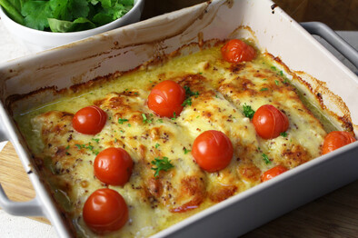 Bake for 10 minutes. Add the cherry tomatoes and continue baking for 10 minutes, until the chicken is just cooked.