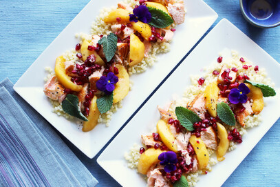 Arrange the salmon, peaches, pomegranate seeds and mint on the couscous. Drizzle with the remaining orange juice. Toss to combine. Serves 4.