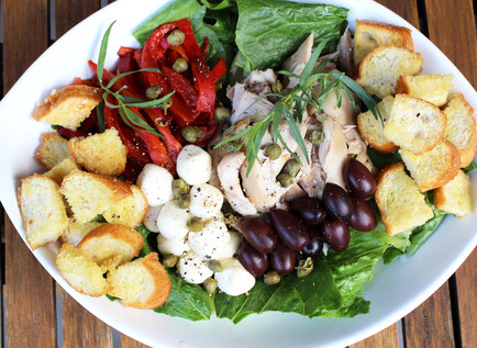 Place the cos in a shallow serving bowl. Top with the chicken, bocconcini, capsicums, olives, capers and croutons. Serve the dressing on the side. Serves 4.