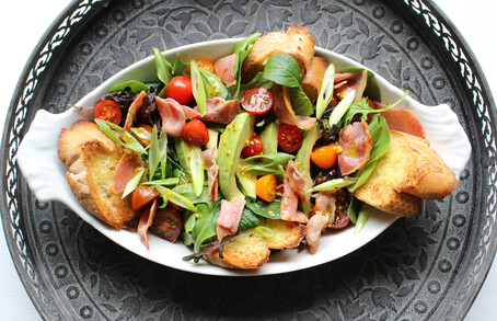 Arrange the mesclun in a shallow serving bowl. Tuck the toasted bread around the outside. Top the leaves with the bacon, tomatoes, avo and spring onion. Drizzle with the combined dressing ingredients. Serves 2.