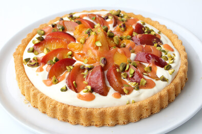 Spoon evenly into the flan. Slice the nectarines and peaches and arrange attractively over the flan together with the apricots. Drizzle with a little sauce. Sprinkle with the nuts. Serve the remaining sauce on the side. Serves 6-8.
