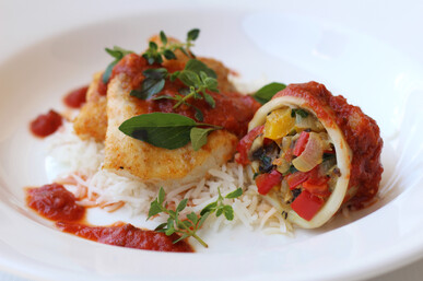With a sharp knife, halve the squid crosswise. Serve with the fish on the side. Great served on rice or couscous drizzled with the pasta sauce and garnished with fresh herbs. Serves 4.