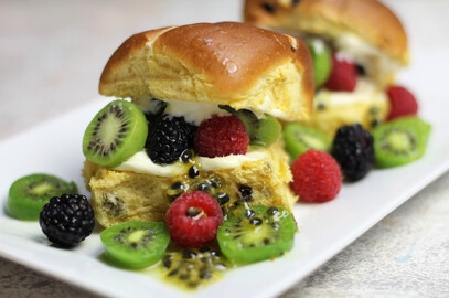 Top the base halves with the berries. Drizzle with the passionfruit pulp and cover with the top halves.