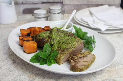 ROASTED LAMB WITH MINT & BASIL PESTO