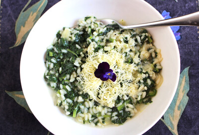 Add the boiling stock a half cup at a time stirring until it has been absorbed by the rice before adding the next 1/2 cup. Cook until the rice is tender about 18 minutes in total. The consistency should still be a little runny, not solid. Stir in the spinach and cook until warm. Remove from the heat and stir in the parmesan.
