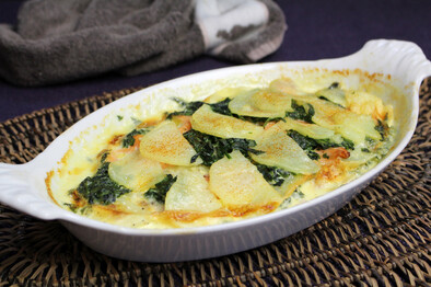 Smoked salmon has a good shelf-life in the fridge and adds a smoky deliciousness to the gratin up next. I’ve chosen thinly-sliced smoked salmon but hot smoked seasoned salmon could substitute