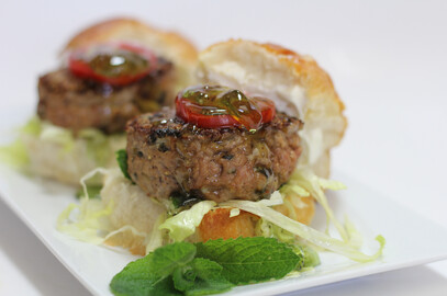 Top the bases with the lettuce and mint leaves followed by the cooked patties, tomato or beetroot. Drizzle with the melted mint sauce and place the bun tops on the side. Serves 4.